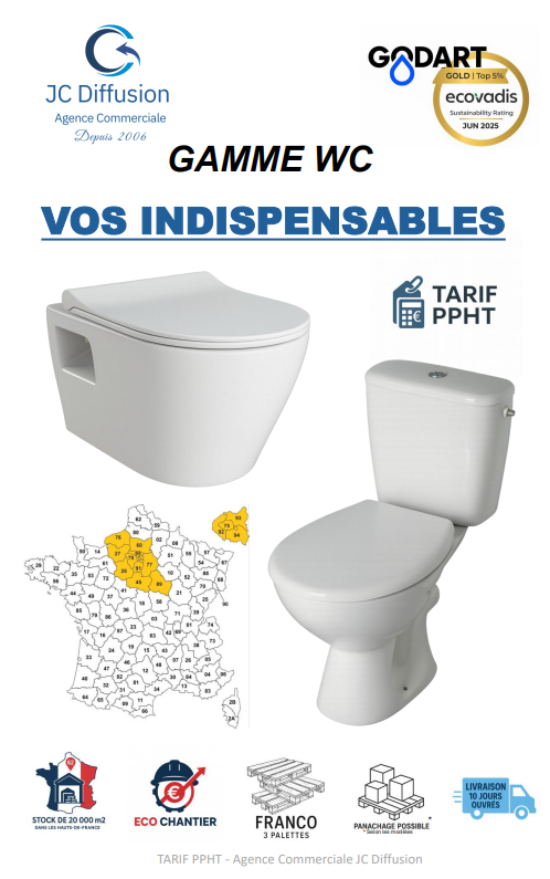 Fabricant‑distributeur français de céramique sanitaire fondé en 1978, GODART propose plus de 300 références : Packs WC, Cuvettes Suspendues, lavabos, receveurs,.... Avec des équipes basées dans les Hauts‑de‑France et un stock de + de 20 000 m², Godart livre rapidement les professionnels. L’innovation est au cœur de son développement, avec des produits brevetés et une stratégie de démocratisation des standards. Par ailleurs, GODART agit concrètement pour l’environnement (réduction des plastiques, économie d’eau, gestion des stocks) et figure parmi les meilleurs acteurs RSE au niveau mondial grâce à sa médaille d’or Ecovadis 2025.
