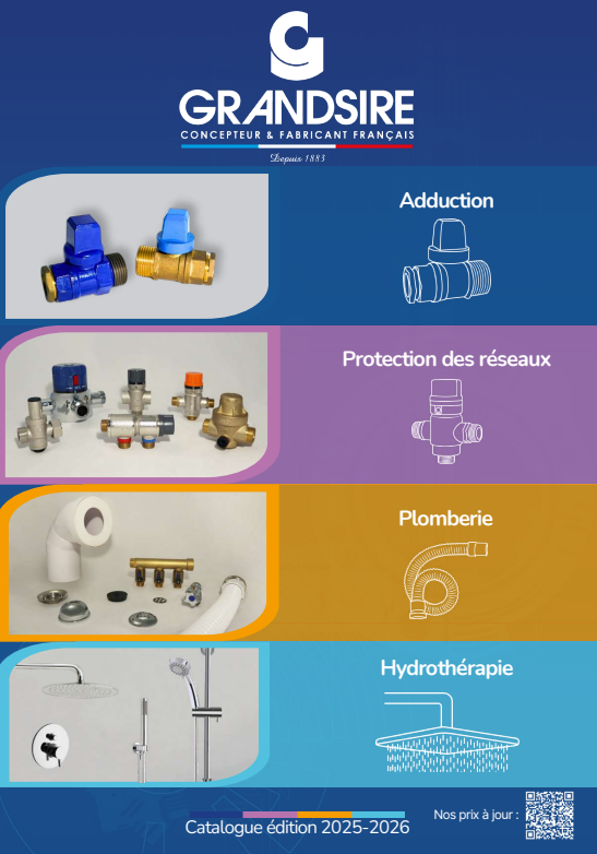 Notre experience au service de la qualité de nos produits ! Depuis la création de l’entreprise Grandsire en 1883 nous avons acquis une grande expérience dans le travail des métaux non-ferreux laiton et cuivre pour la fabrication d’une gamme d’accessoires pour appareils sanitaires.Aujourd’hui, Grandsire est le spécialiste de la protection des réseaux sanitaire avec notamment la gamme de mitigeur la plus complète du monde. Nous ne cessons jamais d’innover et de nous développer, nous possédons également une gamme Hydrothérapie, Plomberie et Adduction. Notre but est de relevé tous les défis techniques pour offrir à nos clients, les meilleurs produits. Grâce à nos techniciens nous vous offrons des produits spécialement créer et uniquement pour vous, avec notre département produit sur-mesure